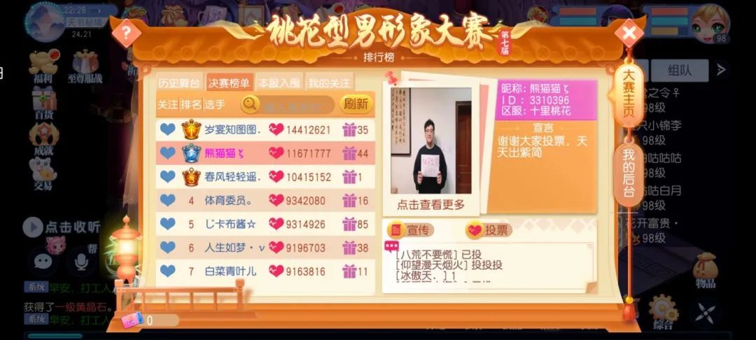 小记者:十里桃花的熊猫猫,非常熟悉的一个id,我相信很多老玩家都认识你,对于本次斩获型男亚军的成绩满意吗?