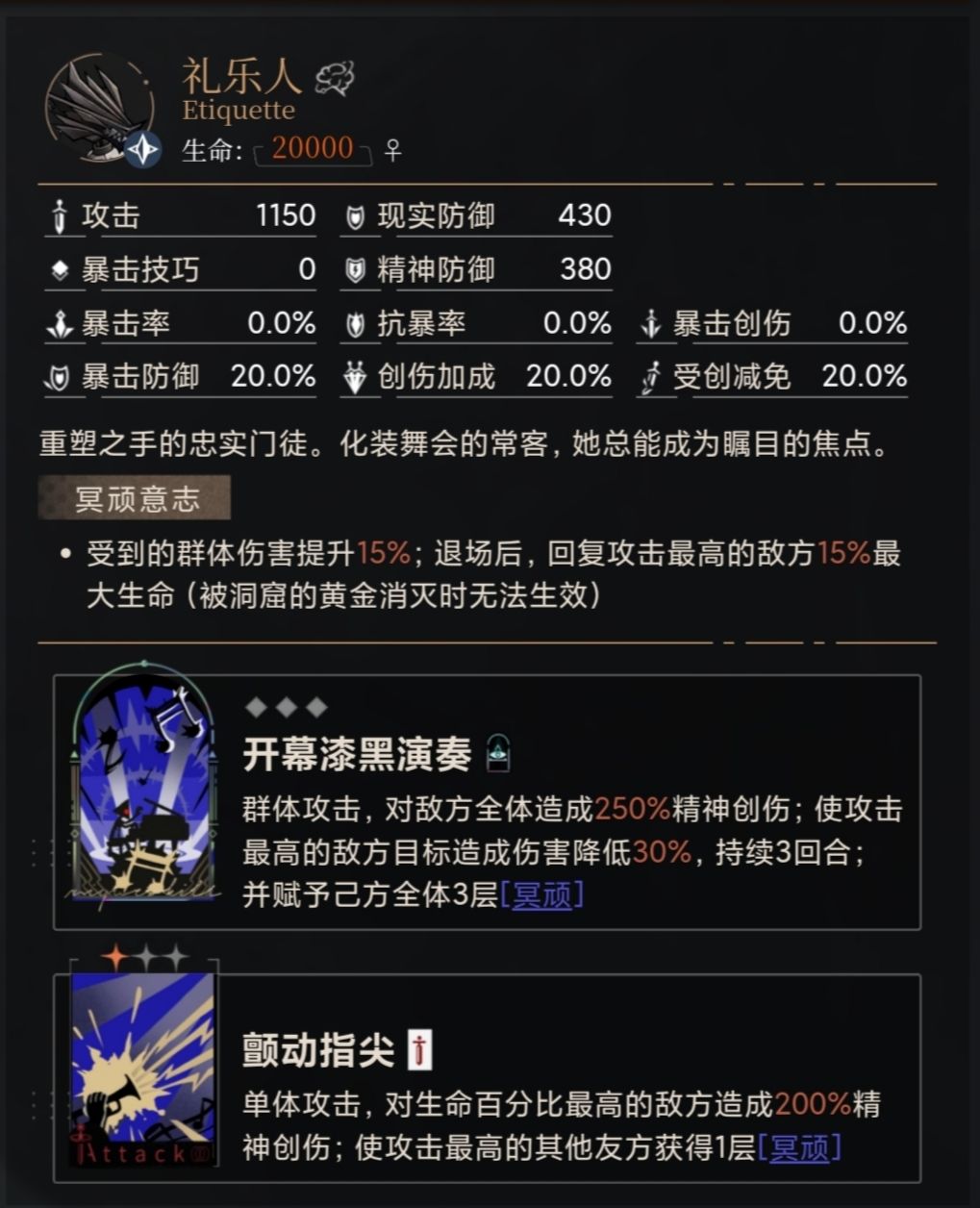考虑这次邮报BOSS为原生灵感,且现实和精神防御属性数值一直,故而主要选择以仪式为主要输出手段的角色,梅兰妮可以再就业了,能够快速积攒激情。同时鬃毛沙砾或许也能够上上场,不过强度不敢恭维。同时,可燃点也是个不错的选择,这几个版本的邮报也都有6的一席之地。