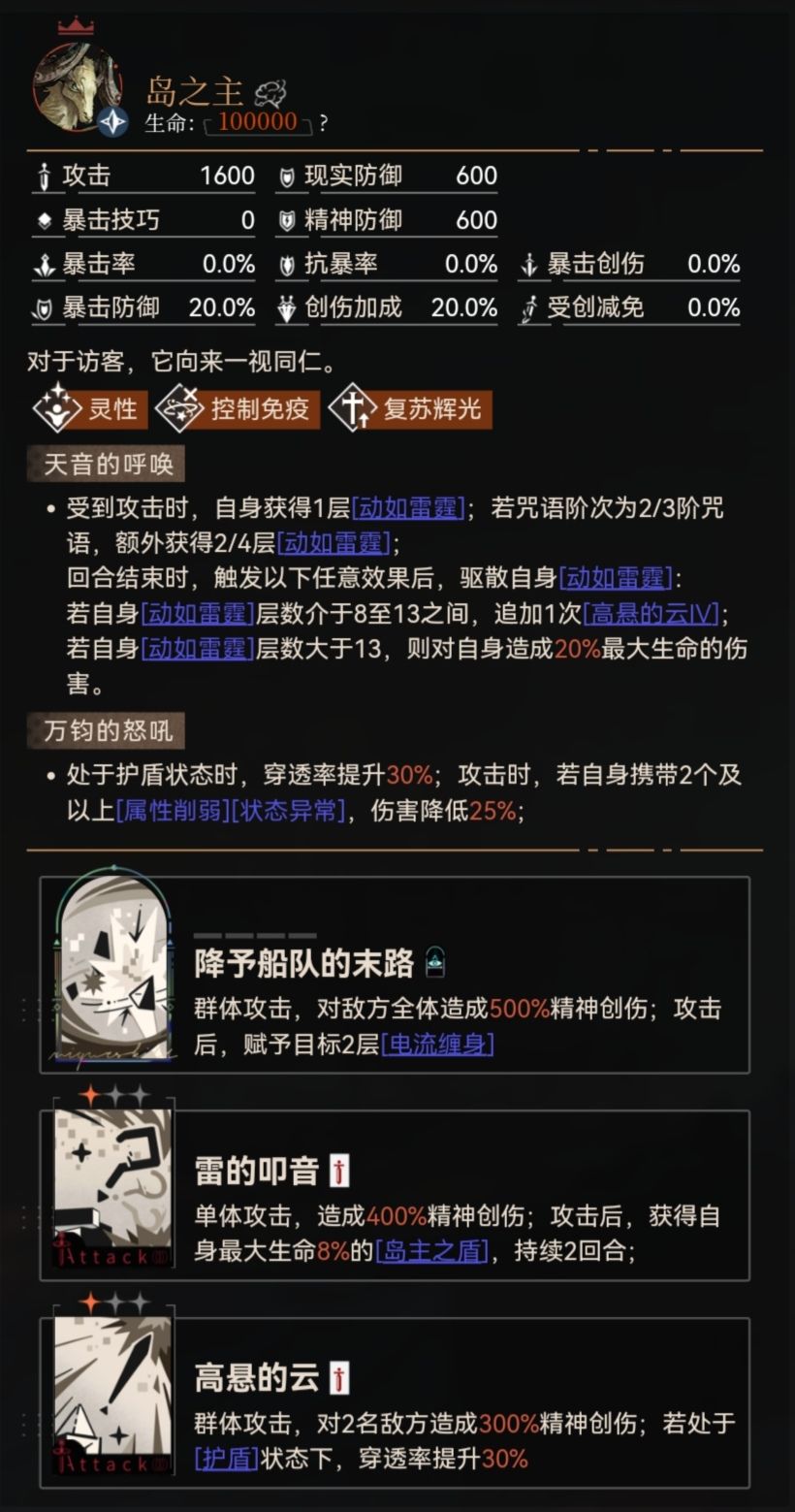 🗡️〖敌方〗处于[岛主之盾]状态时,受创减免提升20%;[岛主之盾]被击破时,受创减免降低60%,持续1回合