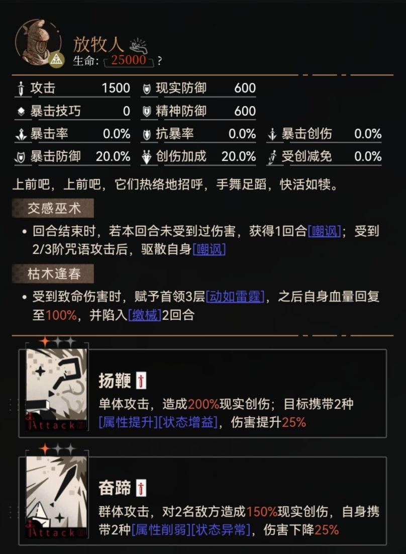 首先需要注意,“动如雷霆”层数在IV阶段后不会随着回合而清空。第二,在回合内不攻击“放牧人”,其会在回合结束时获得“嘲讽”状态。
