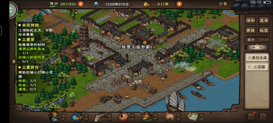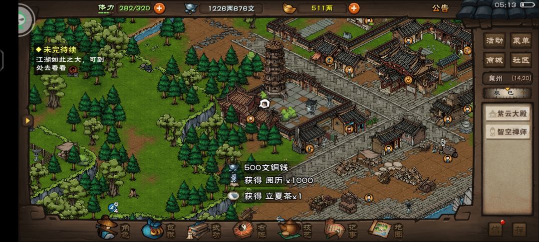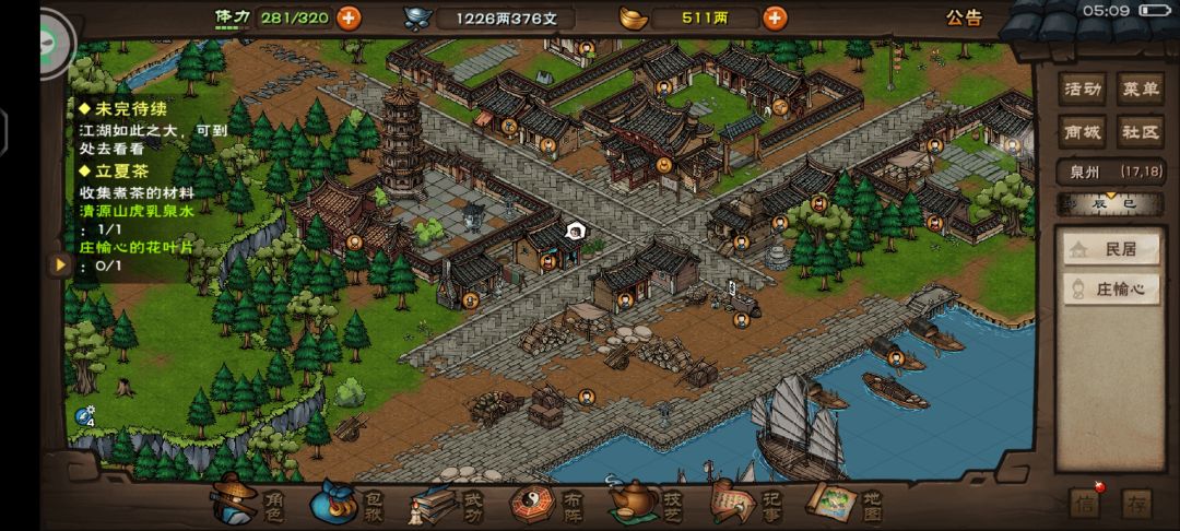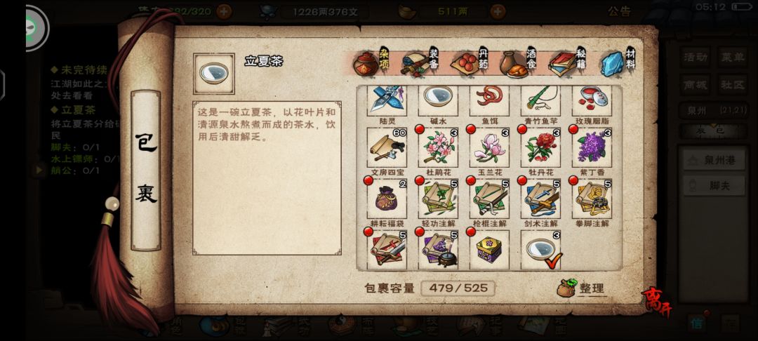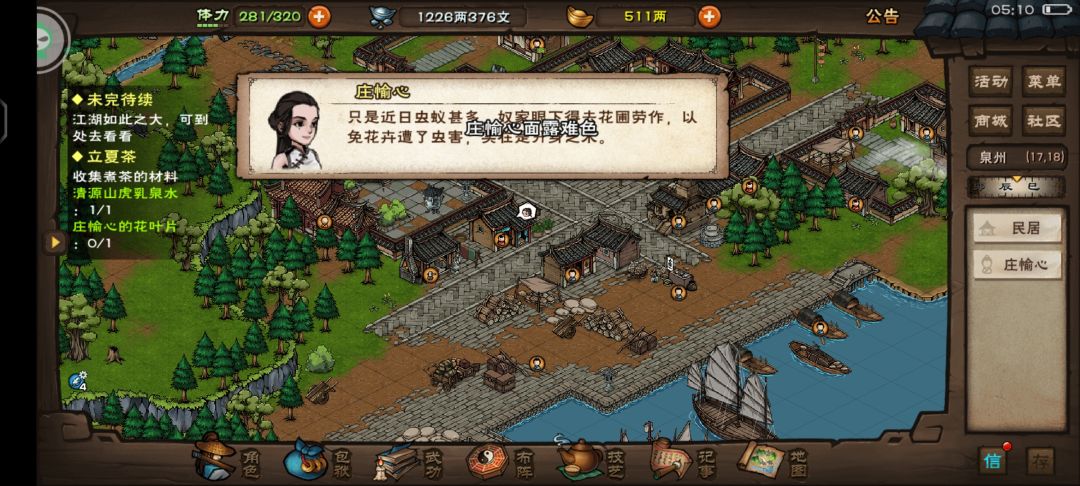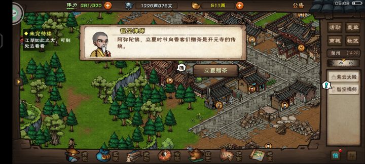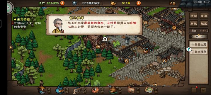 泉州开元寺(14,20)对话智空禅师,得知寺内立夏茶不多了,需要虎乳泉水跟花叶片熬制。对话完得到木桶,清源山(2,4)/(3,4)/(4,1)处打水。
