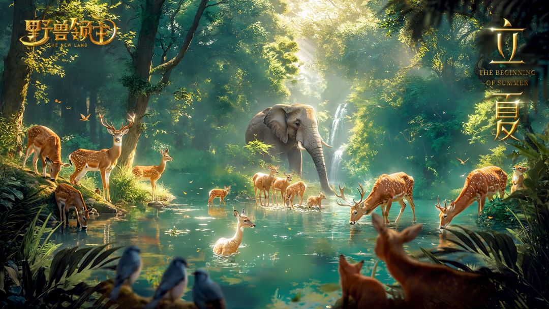 在茂密的丛林深处,野兽们也欢欣地迎接这一时节的到来。大象静静伫立在小溪边,它长长的象鼻轻轻卷起,品味着溪水的甘甜;小鹿们轻盈地在溪间跃动,感受着溪水的清凉,温暖的阳光轻柔地为它们镀上一层金边。