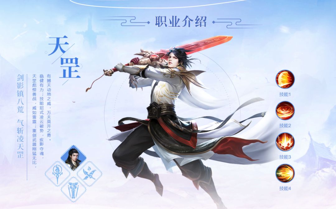 剑影镇八荒,气斩凌天罡天罡彪悍善战,威如雷霆;重剑武器刚猛无比,稳健有力;技能招式凌云破势,疾影夺魂,有撼天动地之威,万夫莫开之勇。