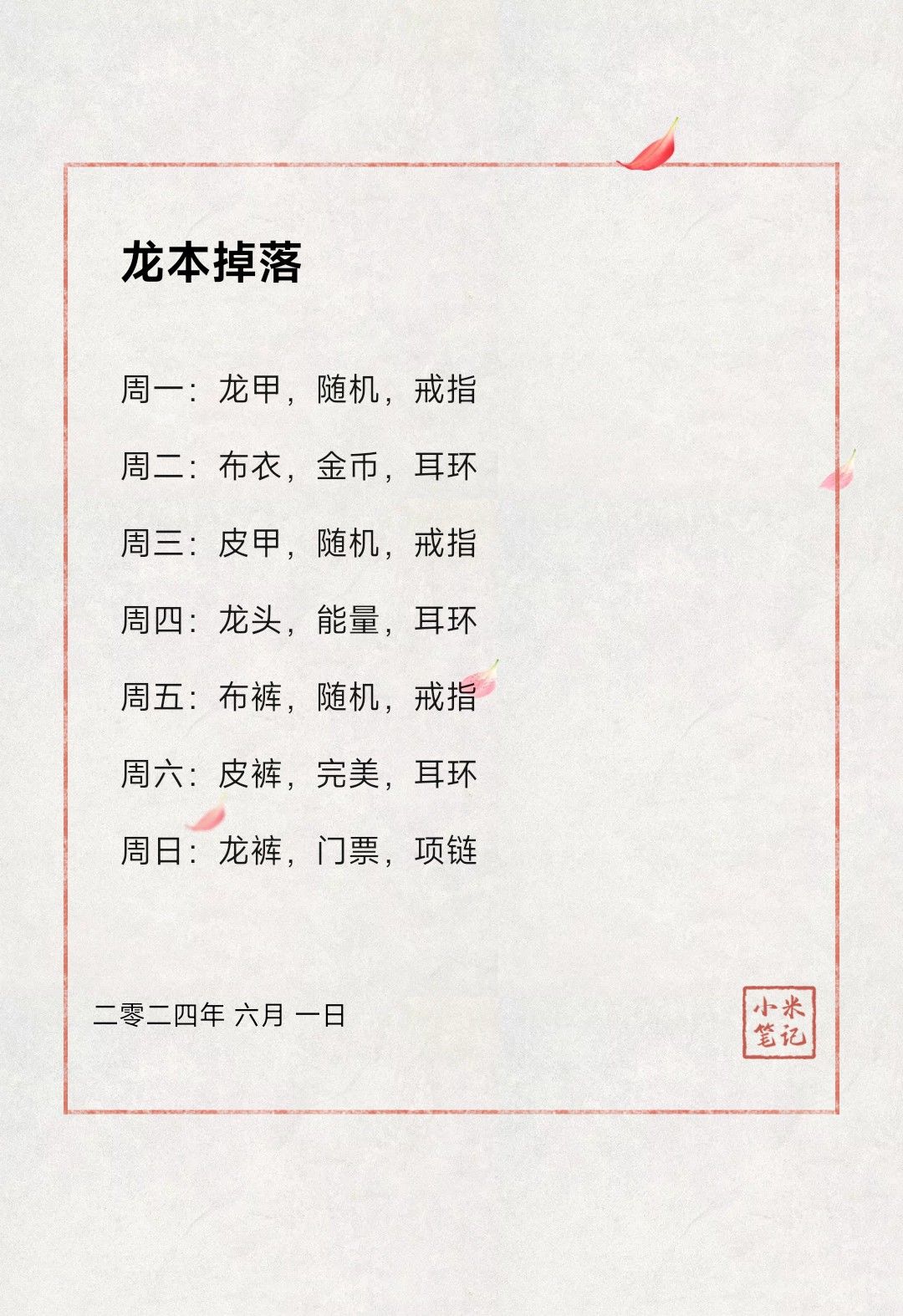 周日门票龙裤龙本最价值,周一龙甲因为掉落资源随机稍次之。