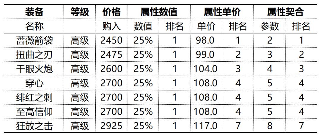 高级装备中,所有装备均提供25%暴击率属性,性价比最高和最低的装备分别是98.00/1%的【蔷薇箭袋】和117.00/1%的【狂放之击】。
