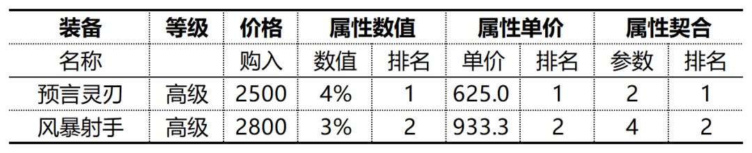 高级装备中,攻击速度最高和最低的装备分别是280的【扭曲之刃】/【千眼火炮】和200的【预言灵刃】,性价比最高和最低的装备分别是5.00的【刀锋之翼】和12.50的【预言灵刃】。