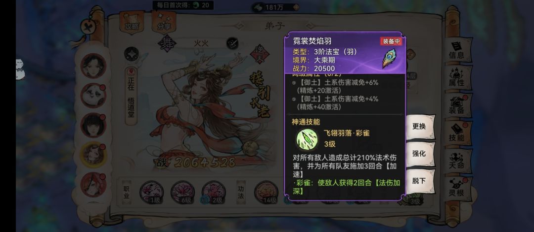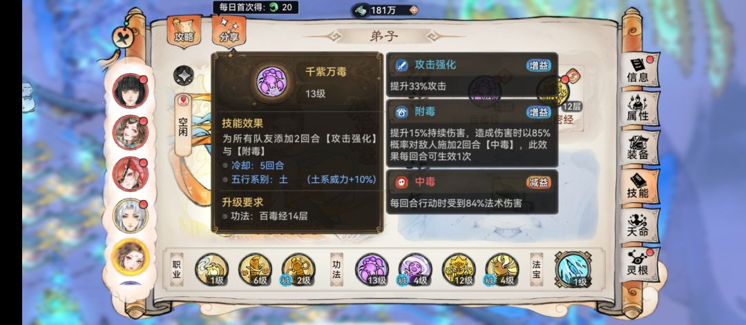 云瑶:减伤好队友,带百毒经和金刚经,金刚经可根据其他情况换成鸣金、大荒、凤魂等。百毒经终于是肝出来了,简直是艰难无比,差一点赶不上渡劫了,因为每天要加速40万符纸和200万灵草,6个大乘超级难出,即使我天天掌门泡禁地,导致主线超慢,昨天晚上才开了3阶法宝。法宝还是带羽毛。大家可以看到,百毒经是直接加33%攻击,同时所有队友的持续伤害加15%,造成伤害时施加中毒,命中率85%还满高的,不知道和巫蛊的70%会不会叠加。这样就会让你的后排释放碧蛇时会施加3个中毒,焰花会挂2个燃烧和1个中毒,极大的增加了无常印的伤害。需要注意的是,它的被动是带百毒经的人造成伤害,才能把对方的免疫变成中毒,所以我给云瑶搭配了群攻的羽毛和金刚经,装备云歌3件套,速度要全队第一,不然附毒浪费了。