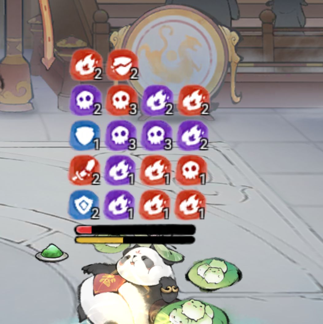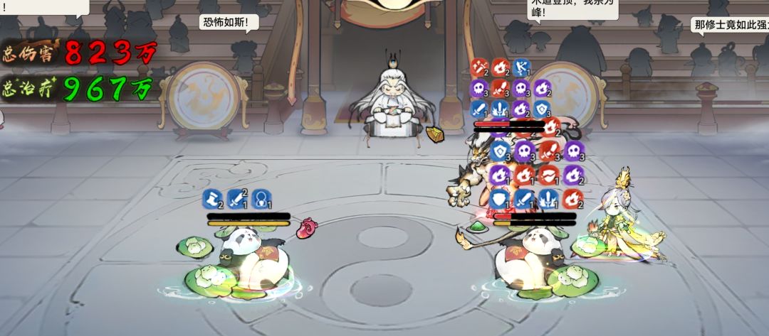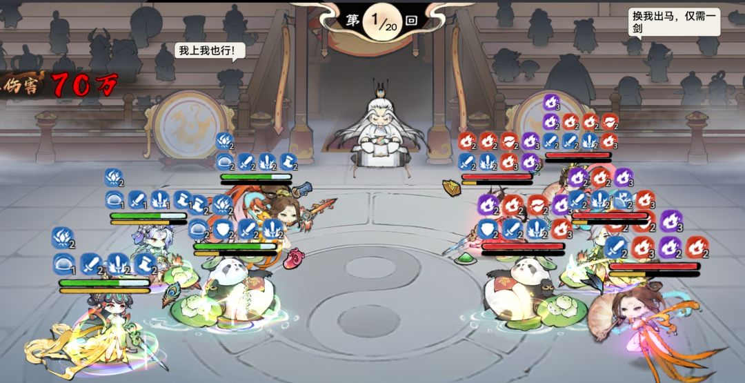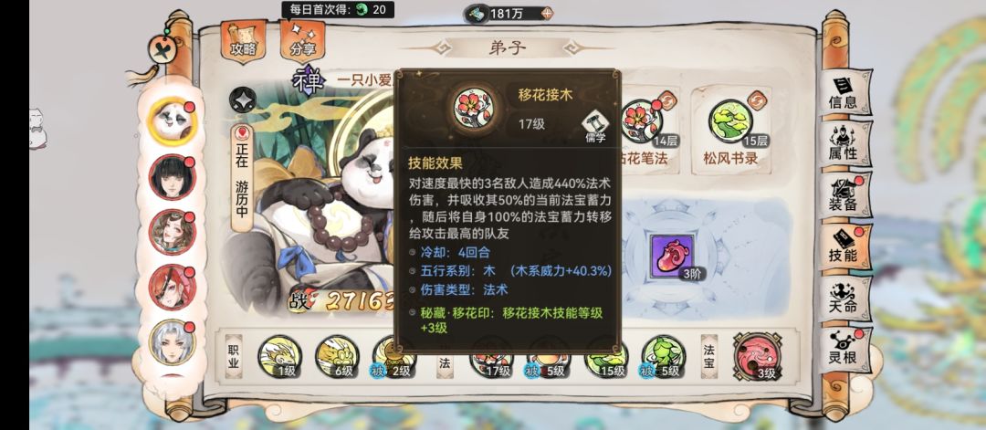 前排:熊猫、小龙人、五行禅、秦冰,前排的作用是复活后排脆皮,抗伤害,加辅助。如果你的前排是熊猫、蛊法宝是角的话,熊猫技能带松风和拈花,法宝带龙玉,如果是五行禅,让五行禅带凤魂,法宝就可以换成木头或者花(花是加法宝蓄力的),木系加成可以通过本命配方去搭配,因为我懒,所以也不去想吃威力加成,我用的主法宝是木头(熊猫是列阵套,木头生命加成50%,可以让开局的盾更厚),配方是木头、龙玉、花,可以随时切换。如果五行禅带拈花和凤魂,就需要另外一个前排带松风了,松风减冷却真的很重要,是巫蛊队不断debuff的关键。带拈花的熊猫如果死的就剩它了,它会用拈花满蓄力,然后用龙玉拉起来秦冰,从而复活全队。带怪时拈花换成乘风,因为我感觉怪没有法宝,有的话大家可以评论区告诉我。
