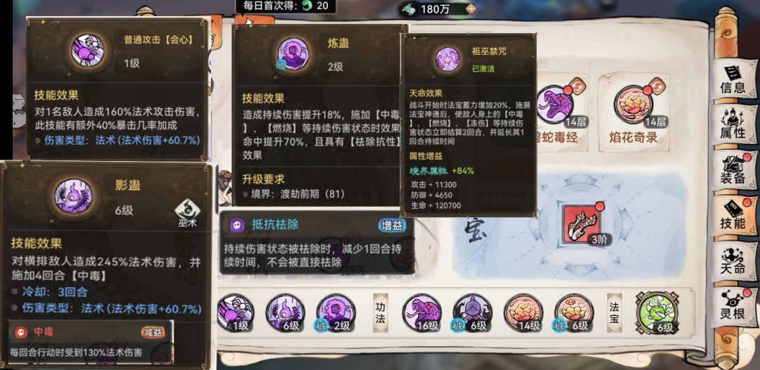 关于灵根,伤害最高的肯定是水火蛊,但是考虑到爬塔,我建议是五行蛊。目前我这个算是顶配,技能带焰花和碧蛇,碧蛇被动有11%的持续伤害加成。中配我推荐天火蛊,技能带焰花和火球术(之前评论区的小伙伴发现的),因为燃烧的伤害是中毒的2倍,同时变异火灵根是加持续伤害的。低配是天水蛊,技能带碧蛇和幽泉录。火球术需要变异灵根后去刷秘藏。