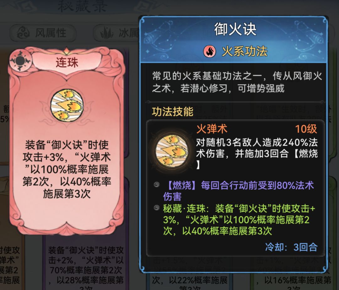 火球术整体倍率是3*240%可以达到720%,同时100%放第二次也就是1440%,如果运气好放第三次就是2160%,然后会叠3个燃烧,我把它称之为小负岳。哈哈哈,和阴阳师那个妖狐一样,运气好一直放。而且三次都会挂燃烧。