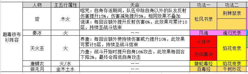 唐蝶衣:巫蛊好战友,天命自带30%持续伤害加深,天命释放法宝减技能冷却,可以快速清除她和巫蛊的焰花被动,同时治疗后叠2层燃烧。功法带焰花和碧蛇,碧蛇被动是11%持续伤害,法宝是3阶羽毛,效果法伤加深,超级适合巫蛊阵容。速度不用最高,建议炼化的时候加19个晶,让法伤加成最高。