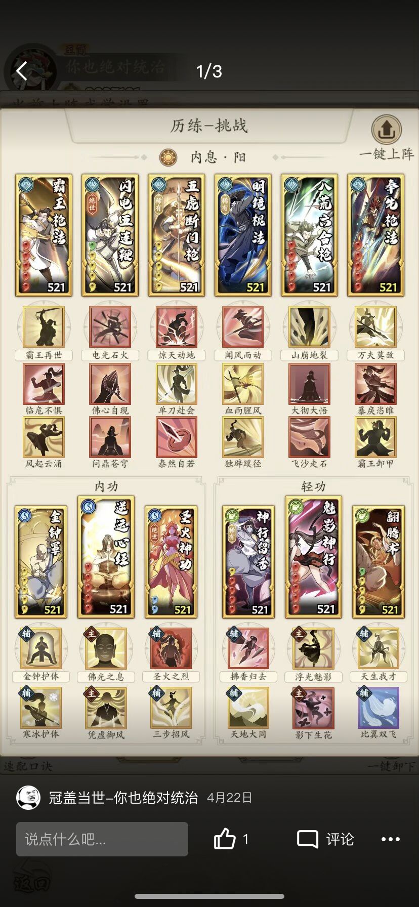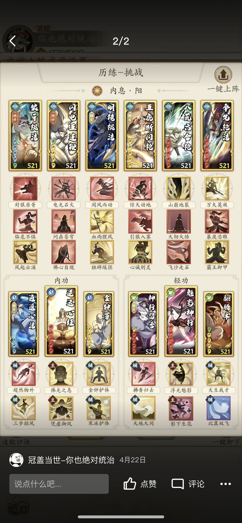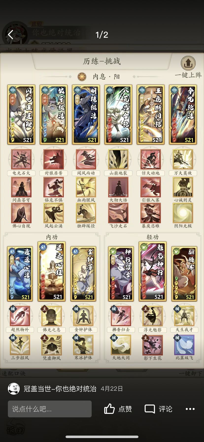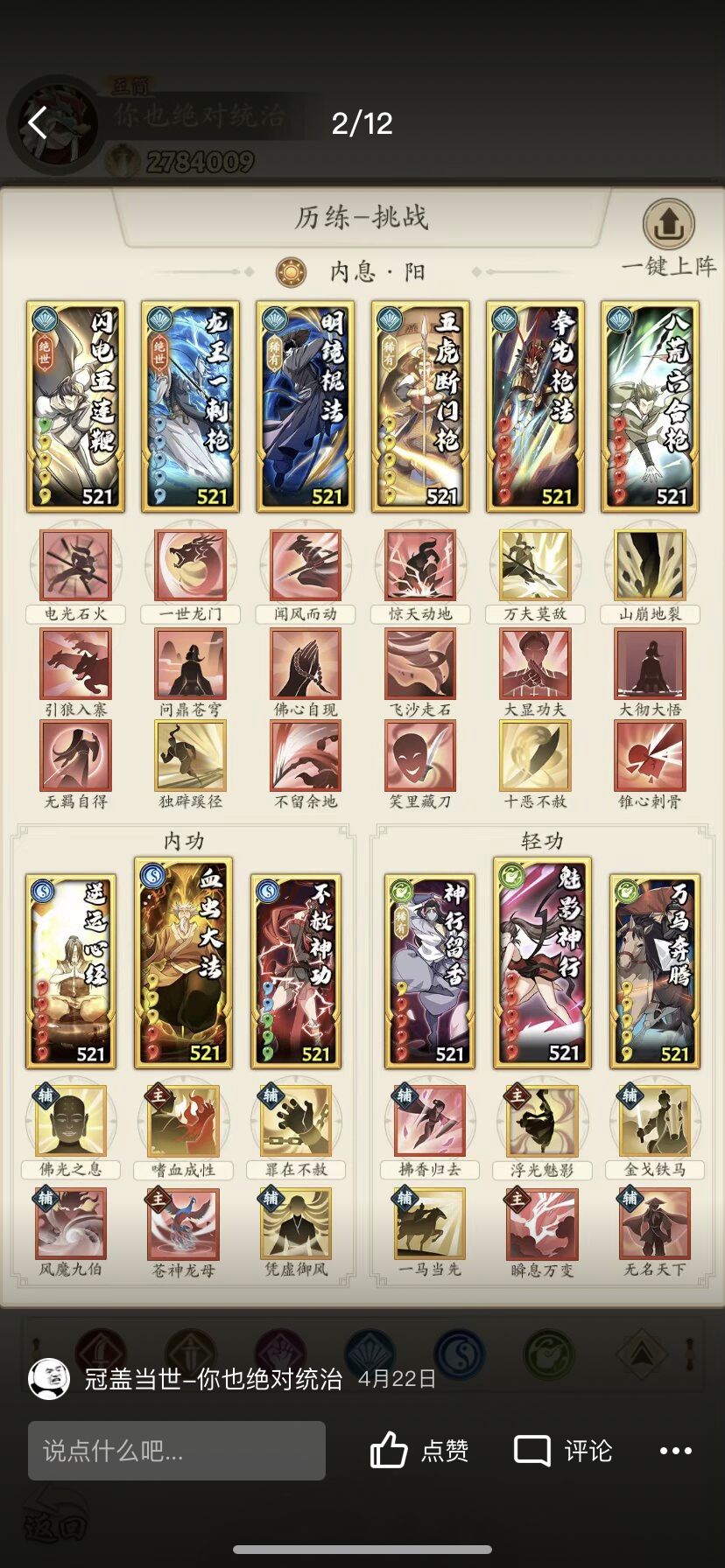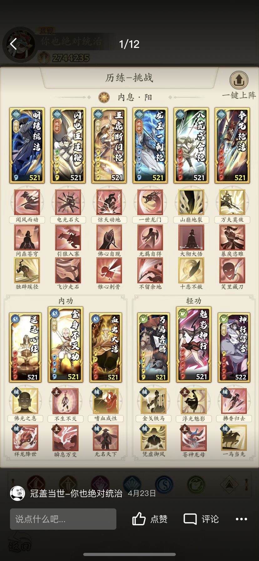 阳奇终于迎来了属于自己的第二个绝世,所有门派卷可以梭哈,阵容经过了前几个高人的洗礼进行大面积改进,选择可以说非常非常多了,有了连爆的情况下,血虫成为了主力,不射也可以根据情况上场,如果区里直伤不多,葵花也可以用万马来代替(血健康的时候连击率的保证)龙母可以配合北斗打沉默寡言,心惊多影下,我比较喜欢防御链3号位的不留余地(化劲)4号位的五虎(心惊)5号位的十恶不赦(恐惧)6号位的大彻大悟(化劲警惕)来保证自己的血量尽量健康,毕竟龙王只有一次,就像开头我说的,龙王的位置和触发逆鳞的时机很大程度已经决定了胜负,越战百万也是家常便饭。非常灵活,五连在龙王和明镜的BUFF下也能一跃成为输出核心,没有出手的阵容更是面对后手流派成了不漏金身。说到金身最后给大家一两套我现在再用的不灭阳奇!