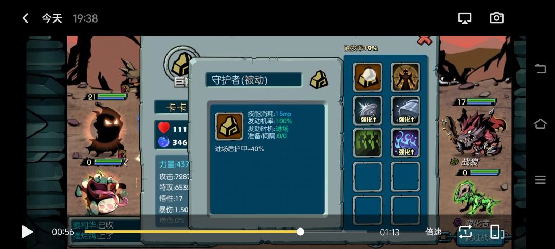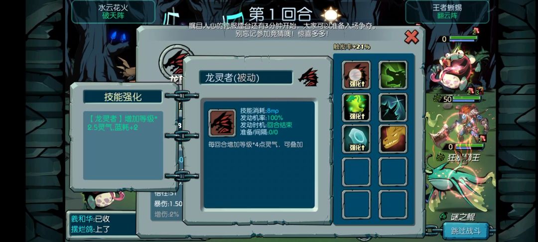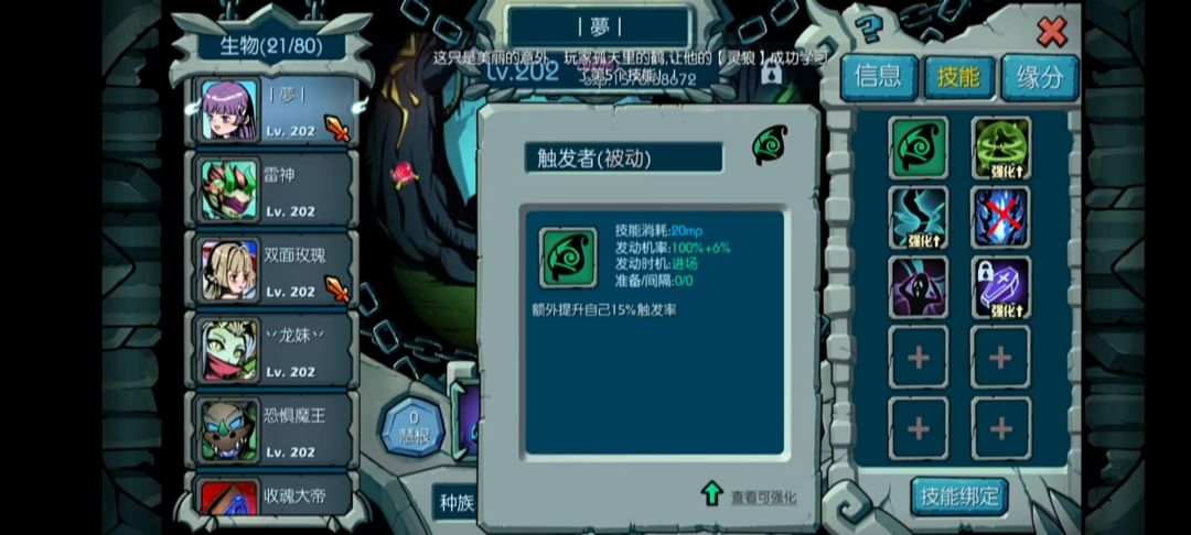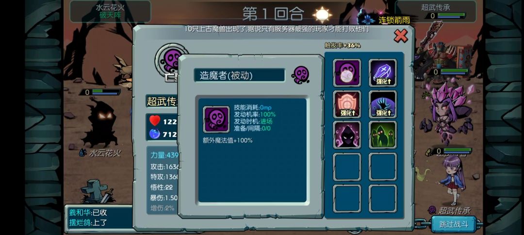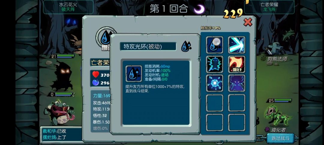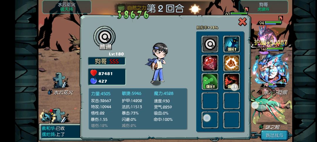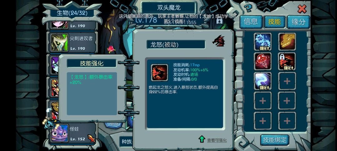 重修转成其他主角后这四个技能是不会变的,只有前两个变化,如果转成巨岩可考虑打个岩精,毕竟前排大多数是岩族,现在假设转成龙族,可以打个龙怒,龙怒是盘古石能开出来的