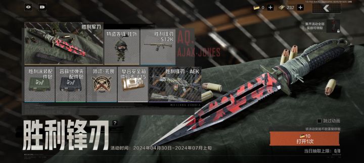 这次军需是给了阿贾克斯的军刀,但这个军刀的质量说实话挺差的,说实话不如突击匕首,好的一点也就在于检视动作可以耍耍杂技,如果想抽的话富哥入手,平民的话弄个15天6格就够了。
