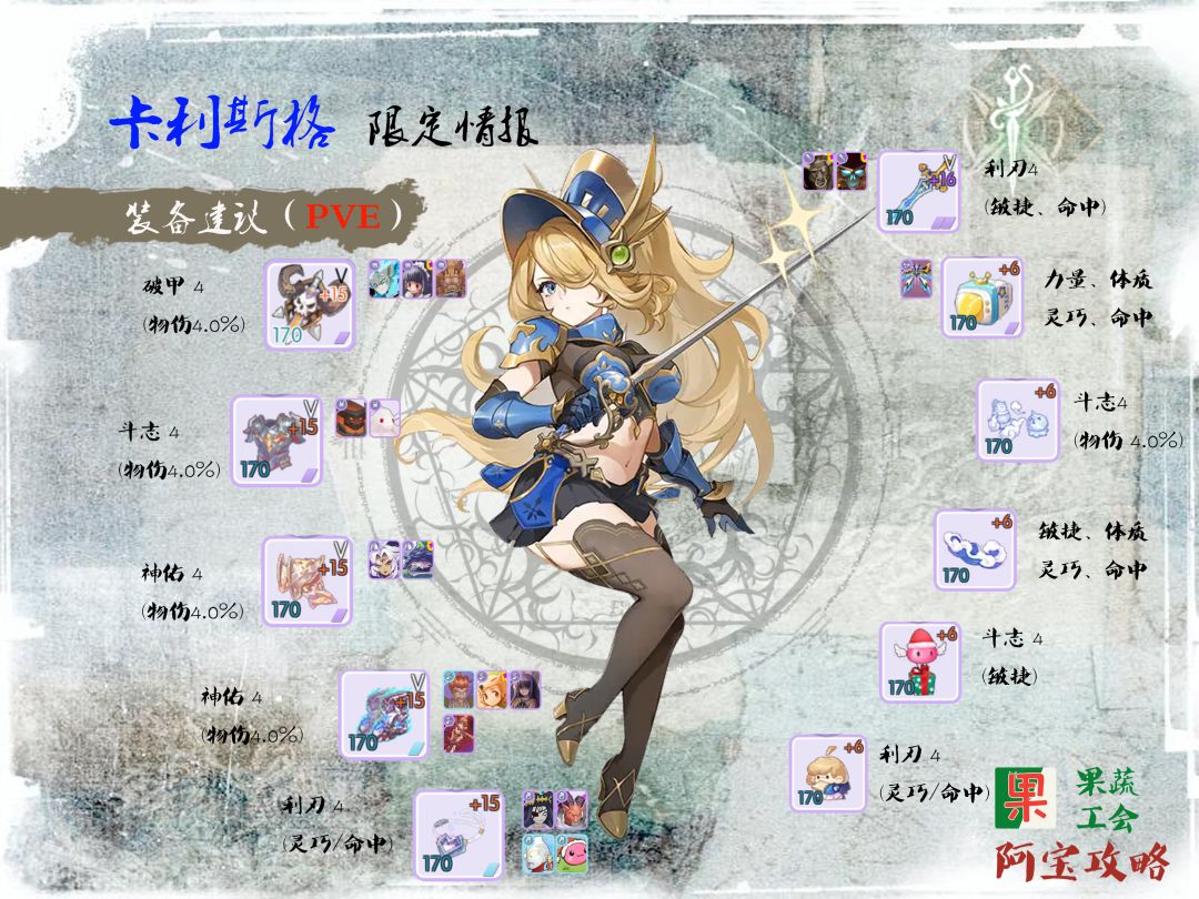 因为卡卡1穿刺=1破防,因此推荐穿刺装备优先,PVE的话,穿刺破防差不多了就搭配MVP增伤和大型增伤装备。具体如下