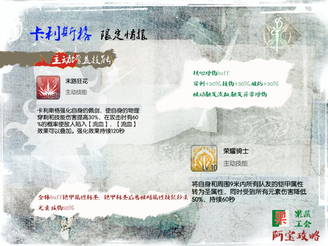 全体转圣属性铠甲,【守护花辰】被动技能使拾取【花瓣】时圣铠甲等级提升到2级,元素伤害降低50%,增强卡卡的生存能力。但要注意的是在博3和神域15测试,发现卡卡会被突然刷新的小怪秒掉,连反应时间都没有,咨询高普无果,推测应该是小怪的暗属性技能打到卡卡的2级圣凯甲上会造成巨额伤害。但是暗打圣是2倍系数,2级圣铠甲不应该会被秒,严重怀疑这里有个bug。