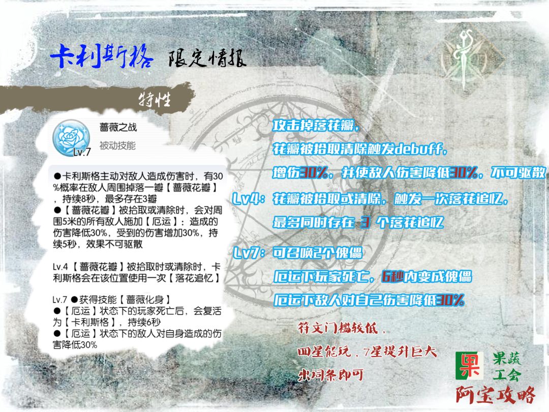 卡利斯格算是符文友好型英雄,3星可玩,6星达到符文门槛,符文数值越高伤害越高,但是也不存在必须刷高才能玩的符文。