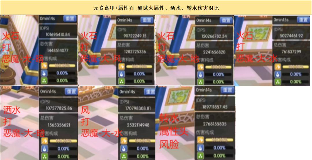 物伤盔甲,测试克制属性石、火属性、洒水伤害对比