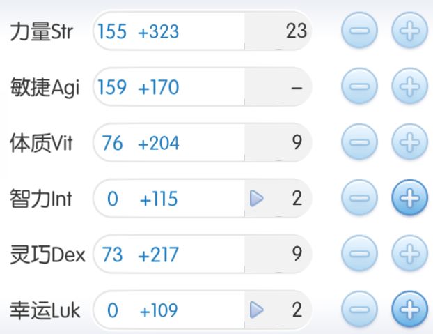 官方推荐 Str 140、Agi 124、Dex 107、Vit 107