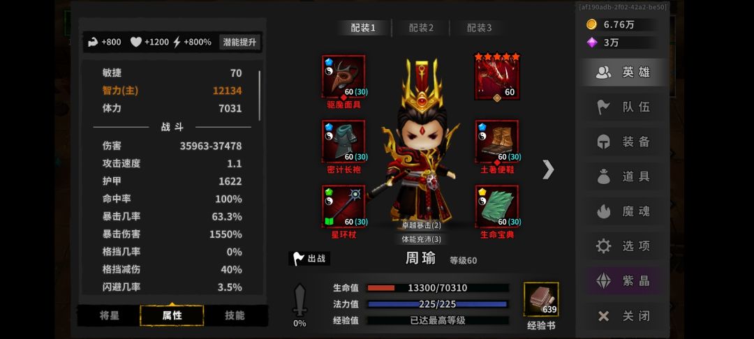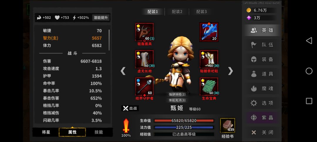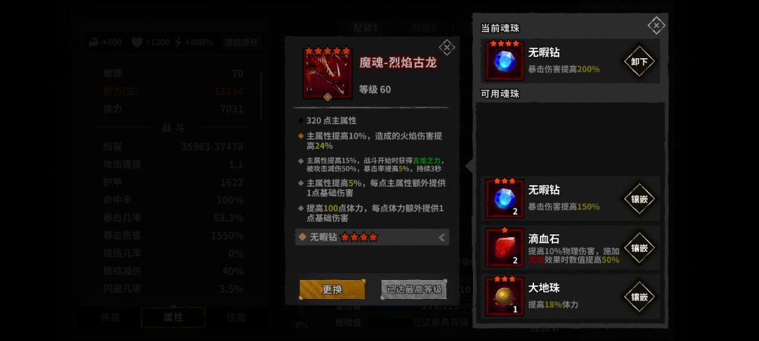 剩下的凑格挡几率以及体力和力量百分百属性就好了。魔魂随便带反正不打伤害,一直用二技能加护盾,大招加30%暴击几率就行了。