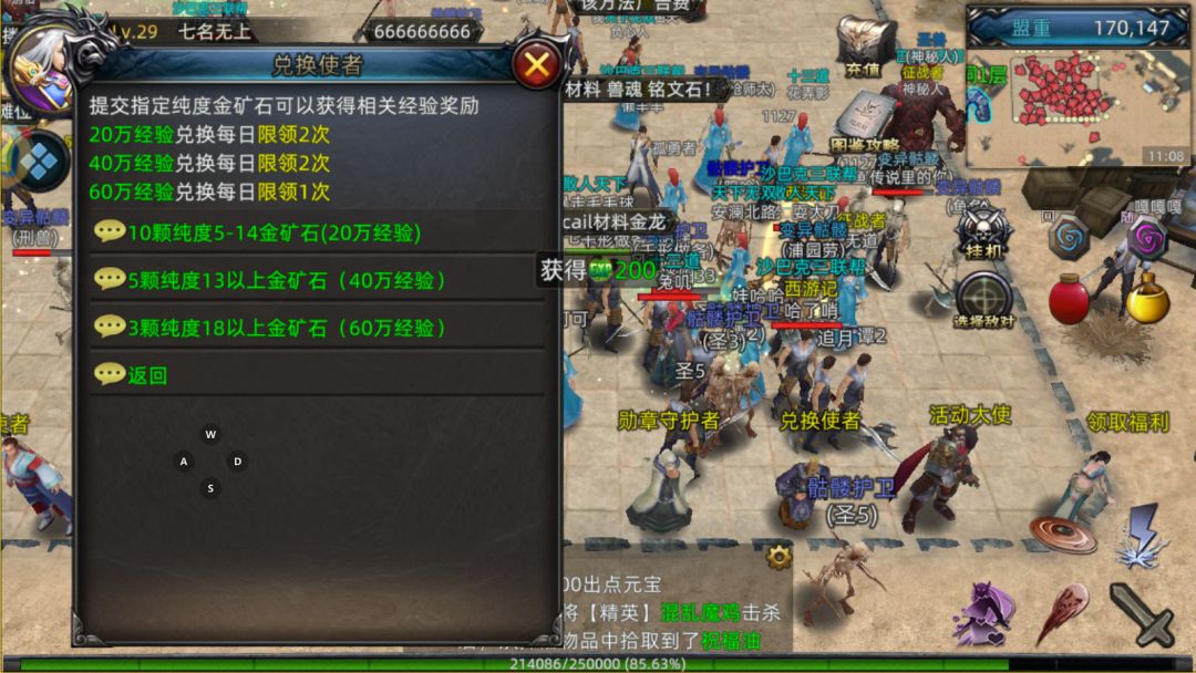 前往主城的NPC——兑换使者处,你可以将通过“矿洞挖矿”活动获得的金矿石兑换为大量经验值。不同品质的矿石对应不同的经验回报。