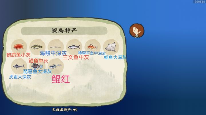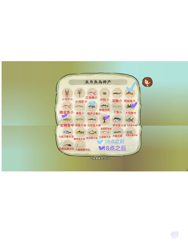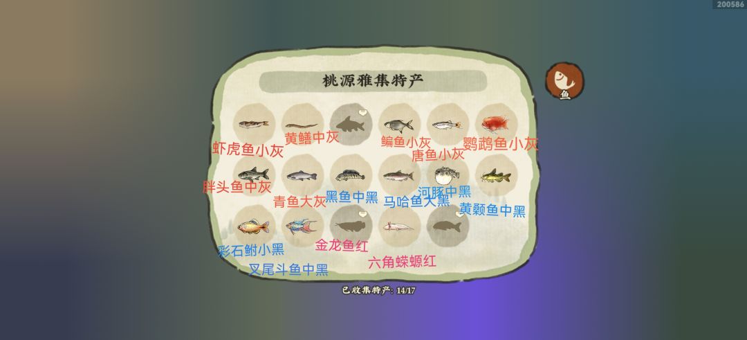 小河虾小、红金鱼小、黄鳝中、橘金鱼小深、唐鱼小、鳜鱼中、胖头鱼中、乌龟大灰?、鲶鱼中深、金线鱼小深灰、八根胡子鱼小深、马哈鱼超大深、金龙鱼红色、()
