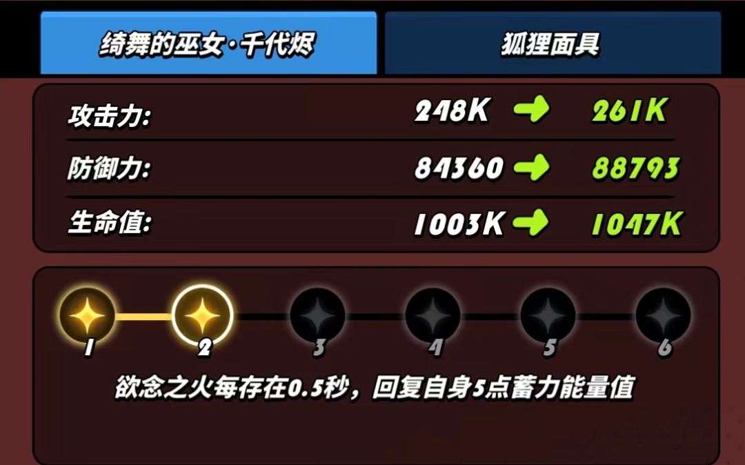 六星:大幅提高欲念之火伤害,尤其在千代烬养成后期暴击数值足够高时输出能力提高尤为显著。