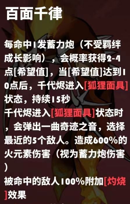 通过蓄力炮命中后的希望值叠层来进入狐狸面具爆发状态,大幅度提高自身蓄力炮伤害,使自身非蓄力期间仍能回复能量。