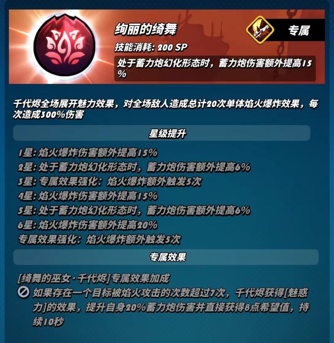 总结: 千代烬的星级提升重点体现在二四六星,二星加快蓄力能量的获取,缩短千代烬的输出循环,使欲念之火全程覆盖率大幅提高;