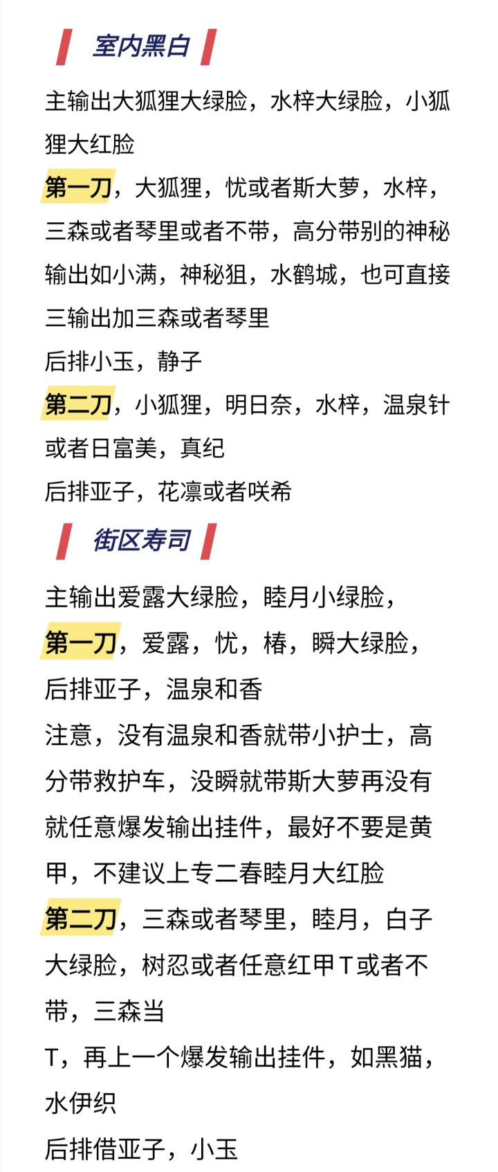 第二,自出专一以上梓,专三睦月作为主输出,副输出如黑猫,水日奈,日奈,水伊织等爆发输出角多多益善