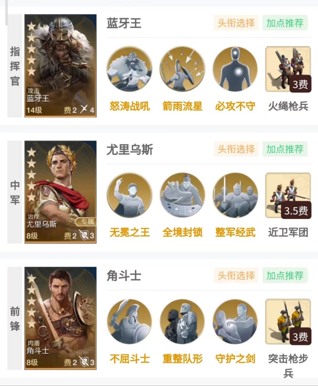 兵种推荐综合实用性以及强度两个维度,前期没有太多技能可以选择一些强力的紫色技能也可以进行过渡使用,等后期有较强的金色技能在进行替换。