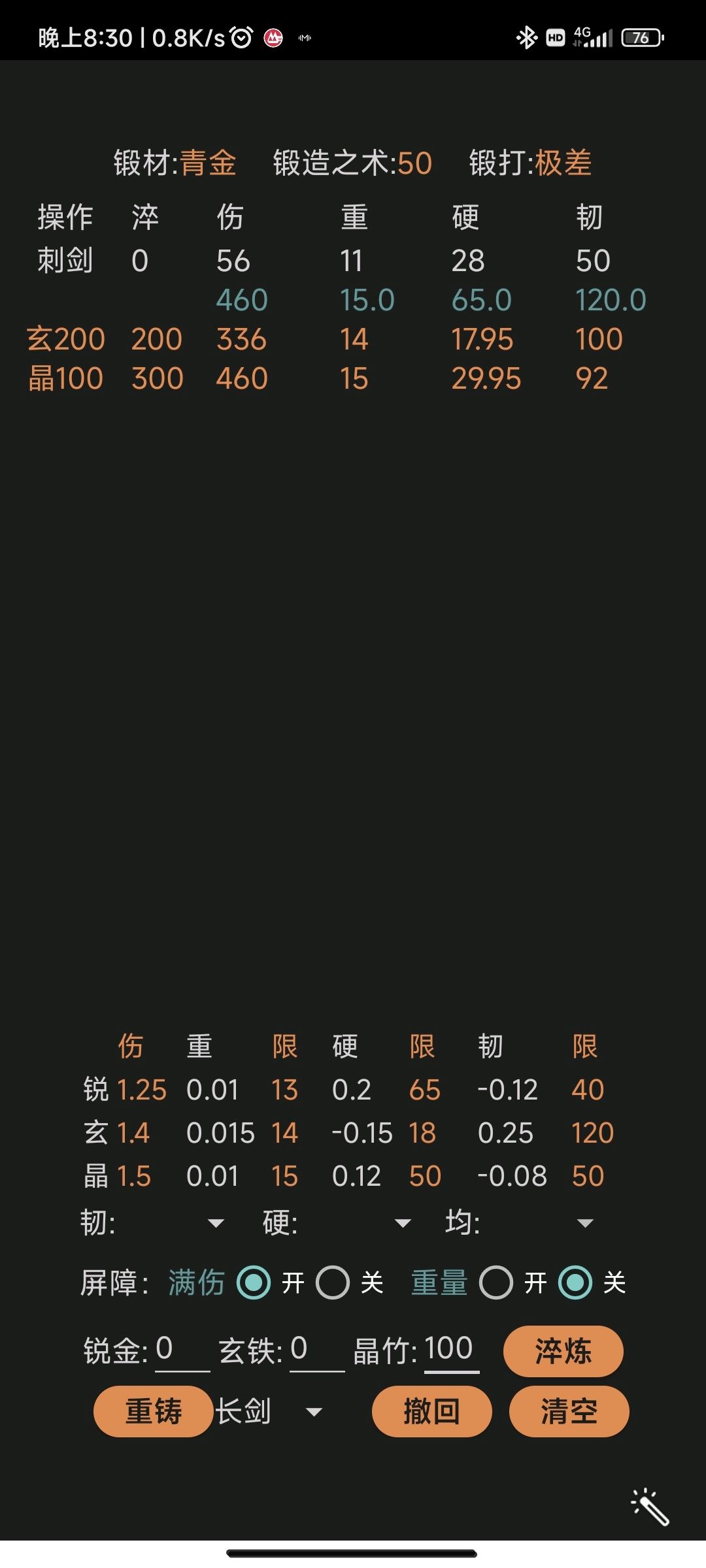 记住一定要按方案上面来,按顺序淬炼200玄铁,100晶竹,要不然神兵属性会出现偏差
