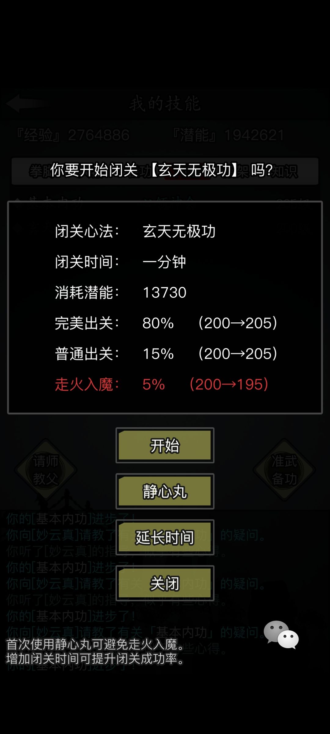 去垫子以后坐上去,然后选择自己要闭关的内功,开始以后马上出来,这就是秒出,这样我们可以只用花五级的潜能百分百概率出关,不会出现失败的情况,如果有涉世之体可以一级一级闭关上去,刷刷经验,内功200级以后就可以使用这个操作,解决前期潜能不够用的情况