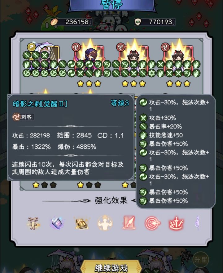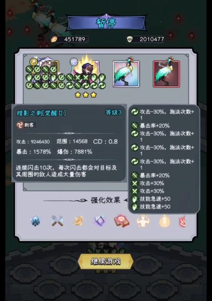 具体玩法:由于影刺不需要靠谬误刷觉醒,可以在他身上堆词条。推荐前期先觉醒一个影刺当主c,然后留2个二星影刺,分别堆10个buff合成20buff的影刺。共鸣需要的魔女可以在buff堆满之后补,前期不用着急,只需要觉醒一个修女和清怪魔女即可。前四个赐福选择怪猎多重凝神致命一击,第五个再补共鸣。