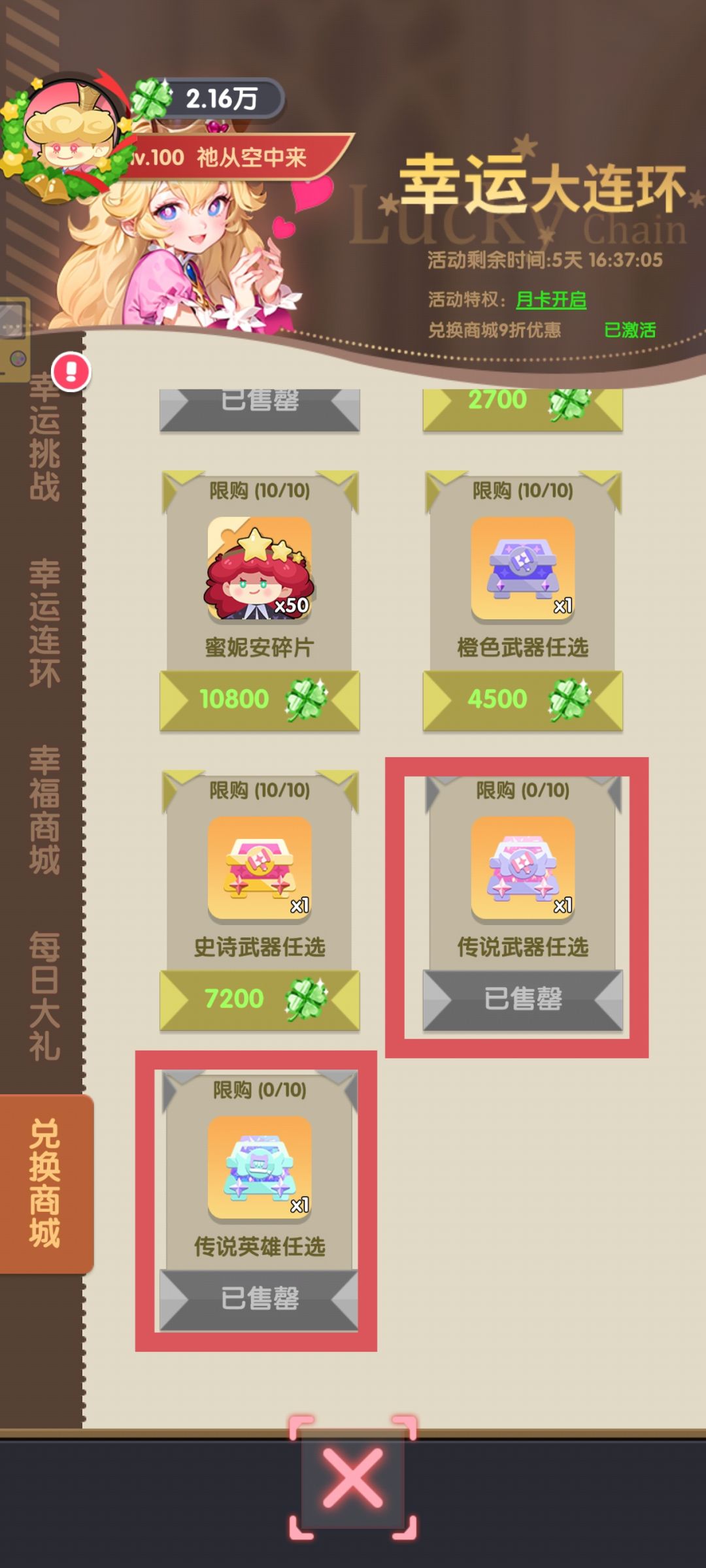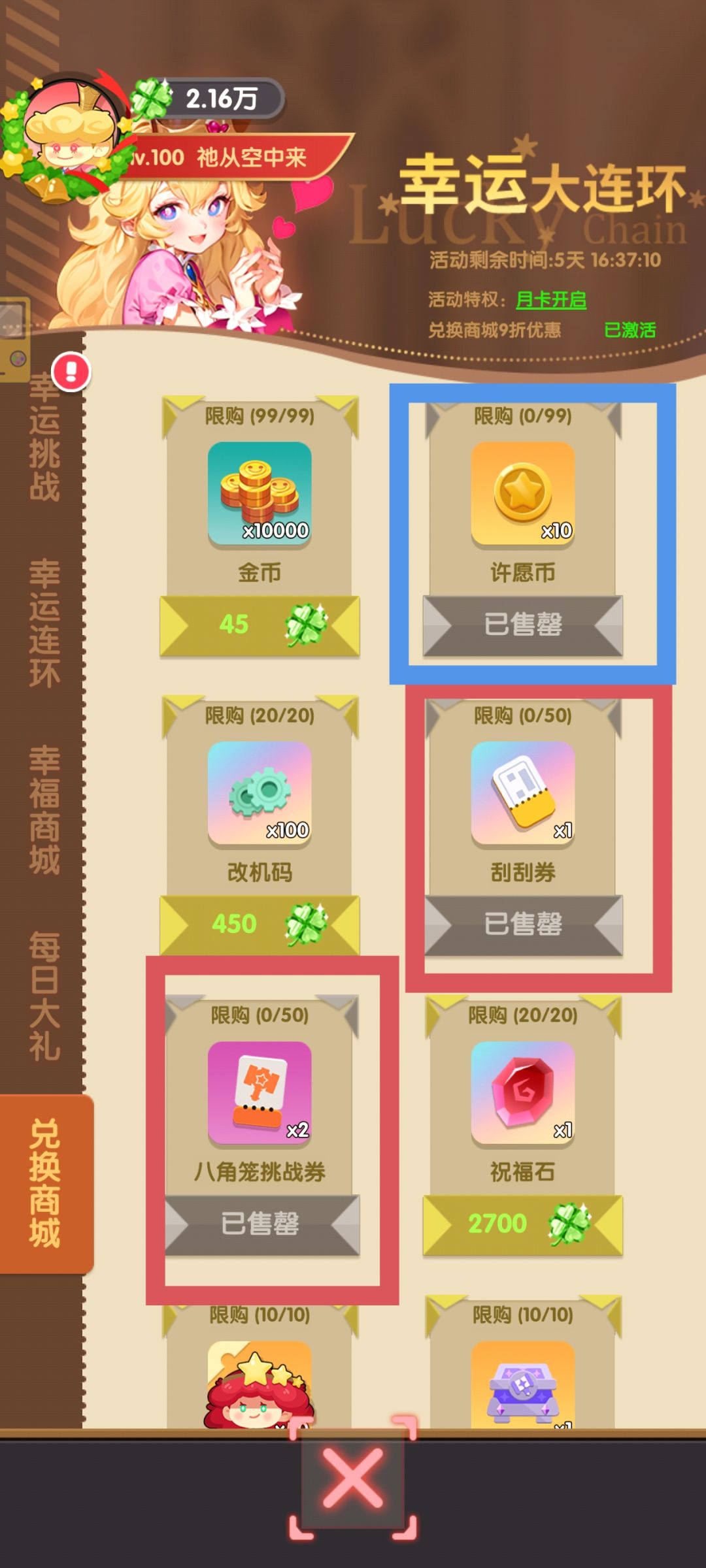 优先换八角笼门票(20张一换,注意上限,打完继续换,送资源的纯赚,可循环幸运草),