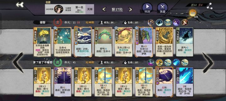 厶重点,正常金丹有修11轮化神,不然就12,斩断后D卡上金卡中天元,乾卦,五雷可以直接走,优先找回响和黄雀,其次气吞梅开,静气和毒阵没牌了就D,不要怕没战力,大不了早一轮二级飞鸿,万花没有回响就是废卡,见外面不是什么多段云崩拳的局该走就走,D出一只黄雀停手摆位,斩断后我们的质量很高,打完D数用不完也正常,阵雁轮椅就在于斩断完质量提的快,没有无解天敌,即使过度烂有冰箱也可以保一定烂分,学会几个基础摆位上分还是很容易的,最后祝各位道友下棋愉快