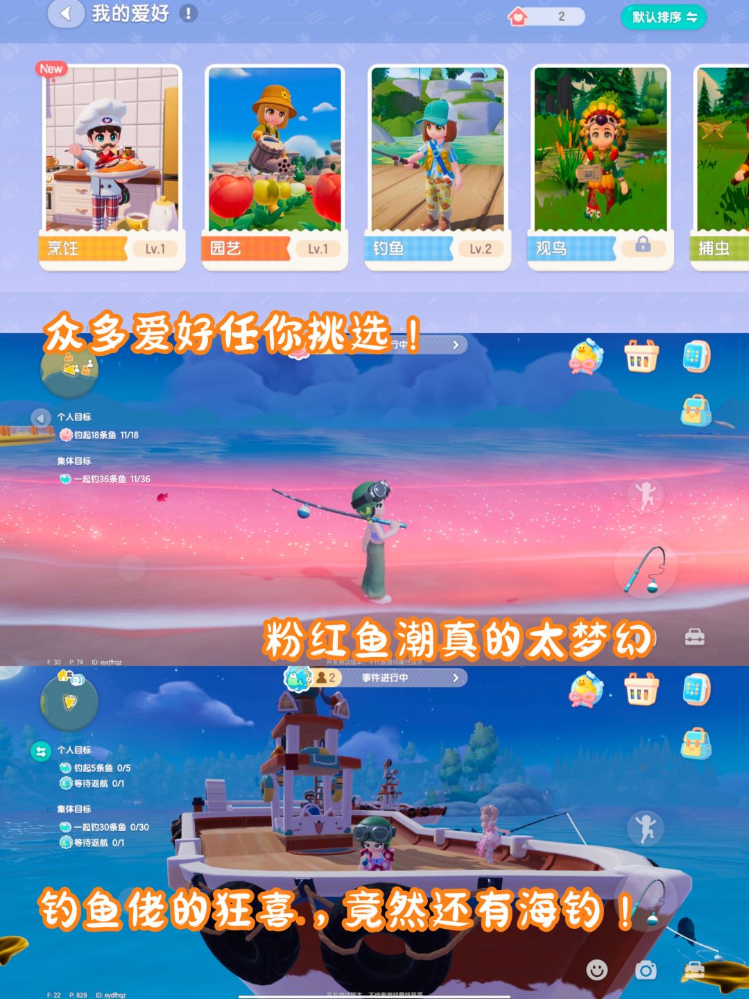 💬:玩法:完成各种任务,钓鱼、种田、盖房、捕虫、观察鱼、还能养宠物,在游戏里享受理想生活,打扮美丽帅气开个好友派对!