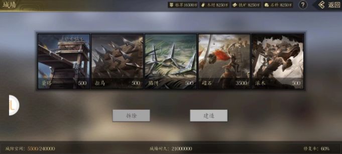 城墙,本城的耐久度上限、城防工事的容纳空间和留守远程兵种的射程,都是由其等级决定。耐久度意味着抗打击能力,工事容纳空间意味着防御设施的数量,最为关键的还是远程部队的打击距离。同样对方也有投石车和床弩的话,你这边的弓弩和投石会凭借更高的城墙等级而获得比对方更长的射程,岂不是占了巨大的便宜。