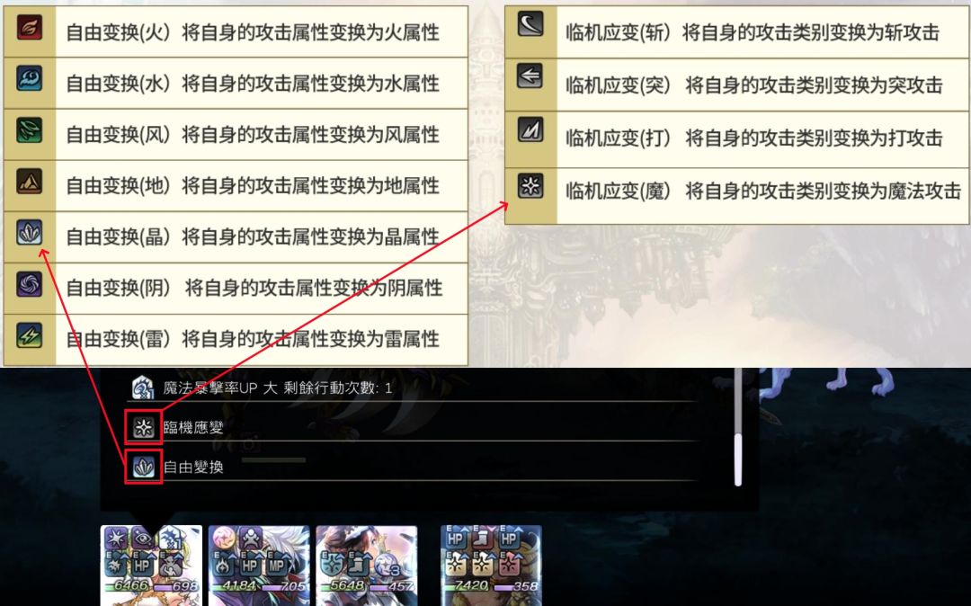 自由变换:将自身的攻击属性变为指定属性 (火/水/风/地/阴/雷/晶)