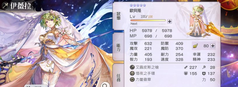 伊薇拉80天值的面板属性参考,1/6的参考数值约为:66力量32智力