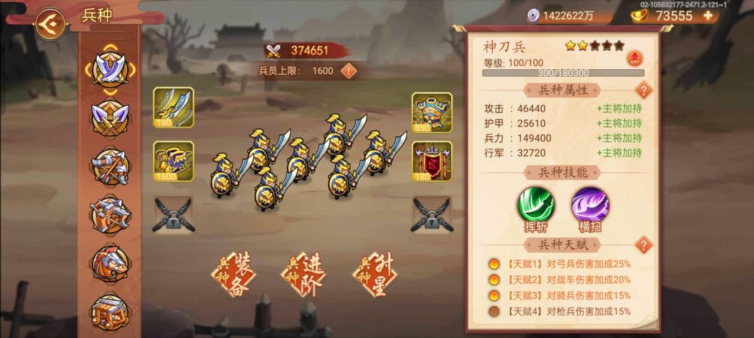 兵种有六个,分为 刀兵、枪兵、弓兵、弩兵、骑兵、神机箭。