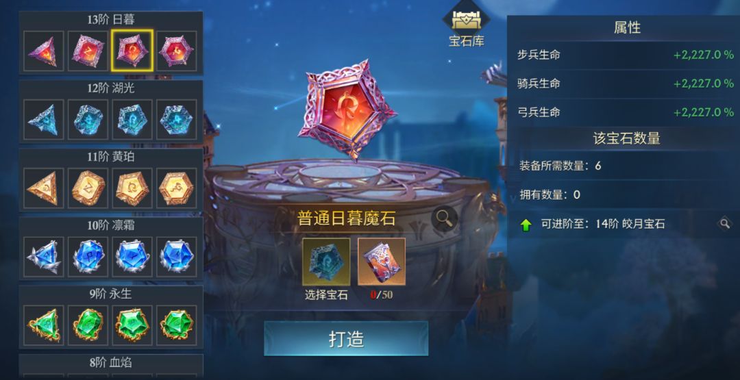 每个装备可镶嵌的宝石类型不同,不同类型的宝石可提供不一样的加成。13阶及以下宝石加成比较单一,除六边形宝石外(我们简单的用形状来称呼各宝石),其他宝石全是对应兵种的属性加成。在资源有限的情况下,我们可优先打造对当前部队提升较大的宝石(可以先部队三维,再兵种攻击,接着再补充防御、生命数值)。14阶及以上的宝石全是部队三维属性加成,但不同孔位的宝石的加成数值不同,我们也可以优先打造部队攻击加成较高的宝石。宝石强化在打造宝石后,还可消耗宝石结晶、宝石之心对宝石进行强化操作。宝石经过强化后可大幅提升其基础加成,品阶越高的宝石强化后属性提升效果就越高。二、 全新秘术宝石