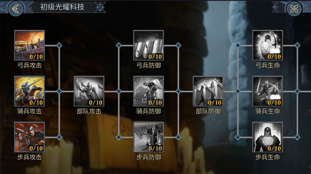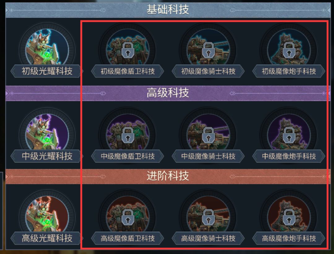 基础、高级、进阶光耀科技没前置的研究要求,可直接进行研究提升三大基础兵种的三维数值。研究矮人魔像科技除了要消耗基础资源外,还要消耗一定数量的光耀石,光耀石获取速度将直接影响到领主们的科技研究差距。