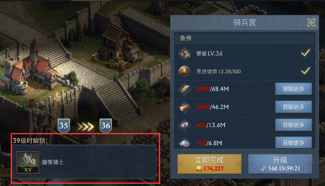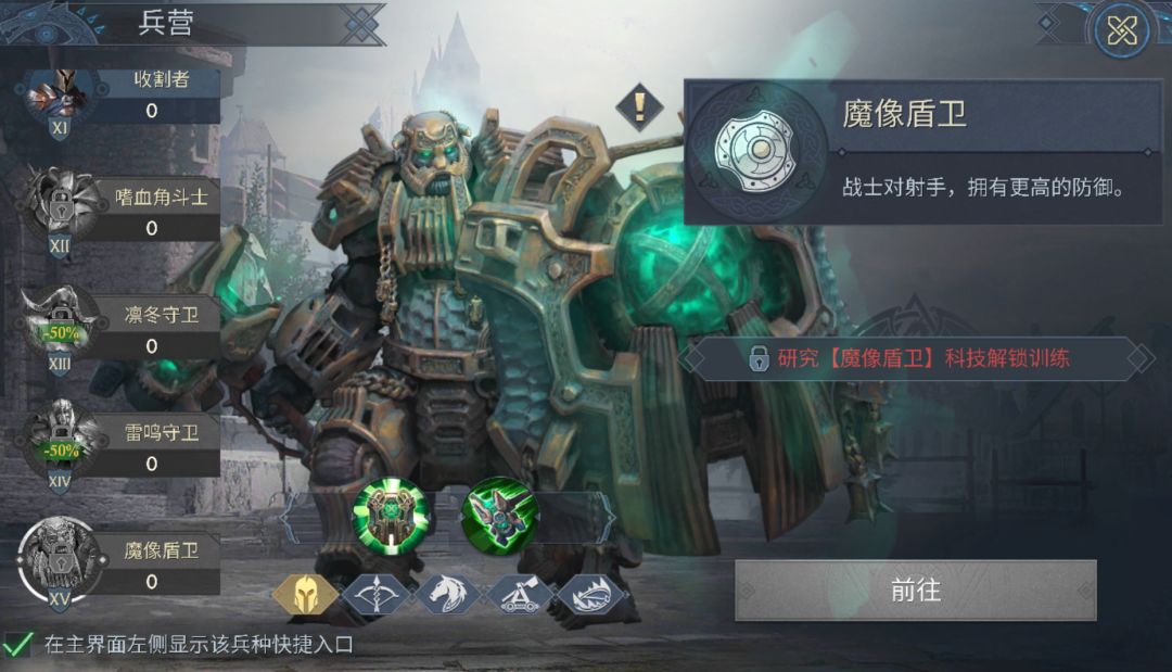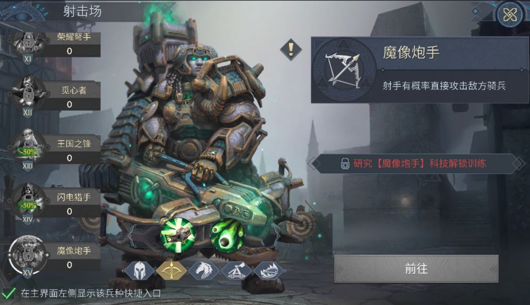 考虑到骑兵在部队中的收益更高,大家可以先研究出魔像骑士,队伍配置高比例的魔像骑士,再搭配T14的步兵、弓兵,这样可以在短时间内做出一支实力强劲的T15骑兵队。