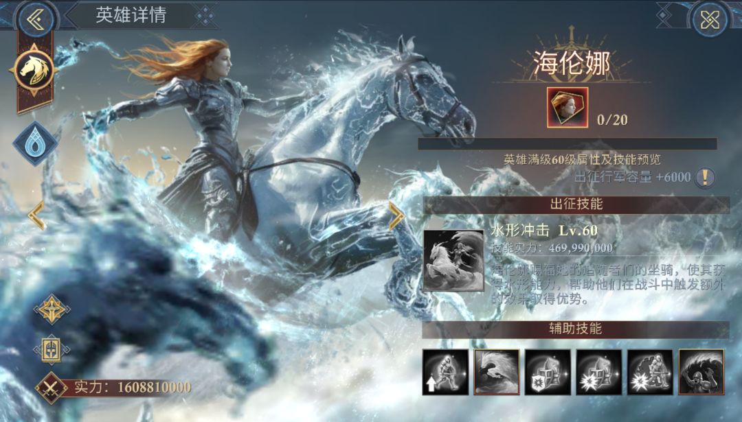 海伦娜是骑兵指挥官,己方最高等级的骑兵队列每五回合进入水形冲击状态,攻击时可对随机队列造成高额伤害。此技能机制可越过敌方前排队列,直接攻击到敌方的后排脆皮。攻击冰冻目标时可提升骑兵伤害及造成额外水元素伤害,可进一步提升输出。在解锁狂暴冲撞技能后,可额外提升最高等级骑兵35%暴击率,进一步提升骑兵输出;如果敌方有冰冻状态,可大幅降低敌方弓兵输出,从而提升己方前排的坦度。