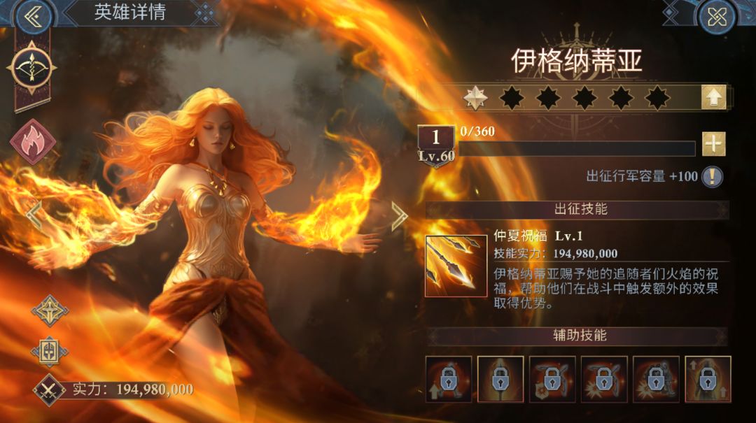 火·伏尔甘可使所有部队每回合攻击后额外进行附加烈焰伤害的火元素攻击,在阵灵达到6星后攻击可对敌方附加烧伤状态。因为伊格纳蒂亚能够立即结算烧伤效果,所以我们的烧伤附加效率越高,队伍的输出就越高。大家在培养英雄、始祖巨龙的同时,还要注意阵灵的养成。