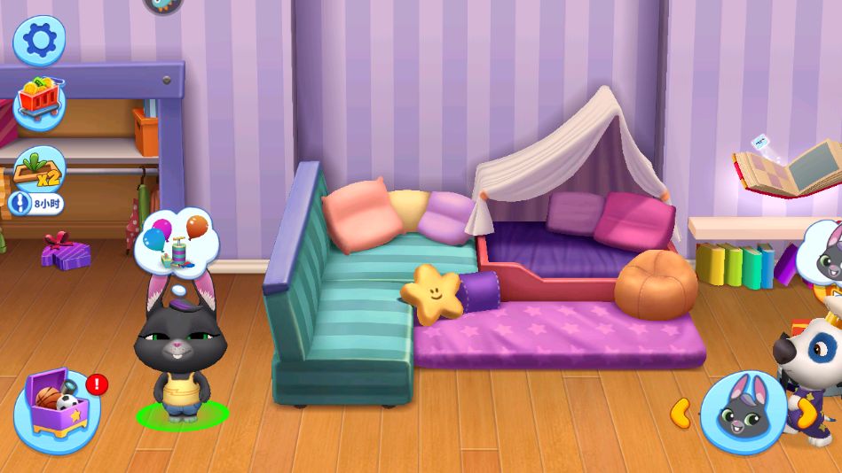 在《汤姆猫总动员》里,总共有六只宠物需要我们陪伴照顾。与传统的养成类游戏不同,多只宠物同时出现在一个场所中进行互动,大大增强了游戏的可玩性,减少我们的审美疲劳。比如安吉拉,汤姆猫,汉克狗等等的角色都会陆续出现,那么随着可爱的宠物们的出场,需求也不断增多。