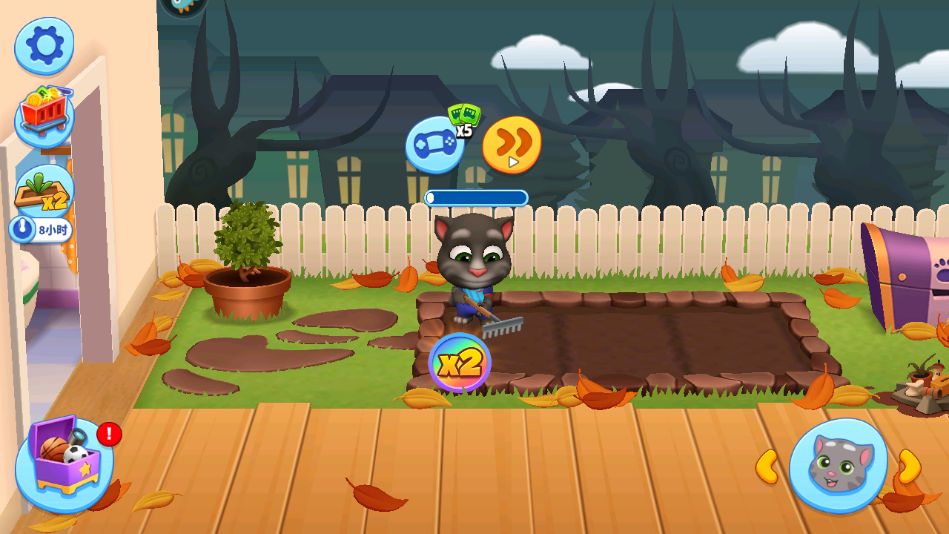 大家有没有尝试过在《汤姆猫总动员》中体验务农生活呢?我们点到后院,将一只宠物拖拽到农田里,我们的宠物就可以触发耕地的动作咯。那么如何更进一步体验呢?我们点击上方的游戏机,可以将我们旅游获得的种子播种到泥土里,进行浇水,让农作物快速生长,获得大量的巴士币。