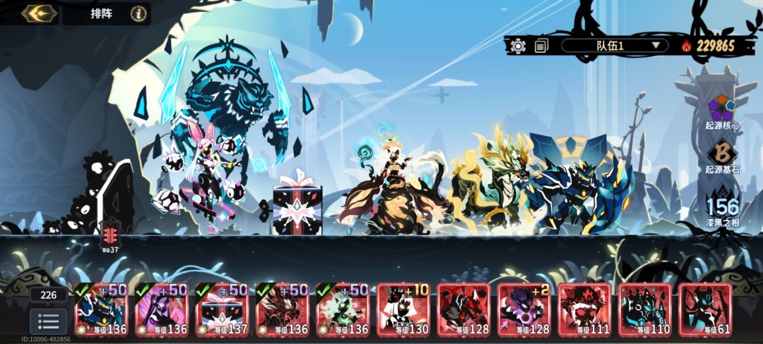 本次队伍由漆黑组件,Joker,莹灵,腾龙,天元.圣盾埃癸斯组成,队伍属于典型的2肉盾1辅助2输出。其中腾龙+莹灵就满足漆黑组件全种族的技能拟态要求,固Joker可以替换任意输出,不受限制。腾龙+圣盾的存在保证队伍硬度和对抗多前排的底气。Joker+漆黑组件,保证了AOE,越T杀怪不二选择。Joker保证了遇到苟队也能轻松拿下。莹灵保证了漆黑全启动,增加对4前抵抗力。而漆黑组件保证了,队伍战争成长潜力。