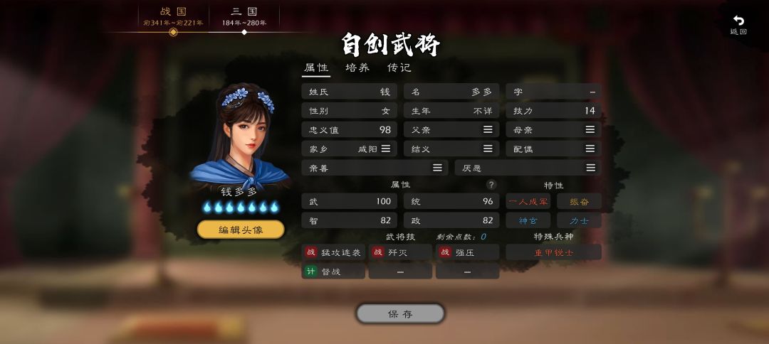 1、武5, 统100,智5, 政5, 重甲锐士,1000兵力,平A和战法加成36%😍